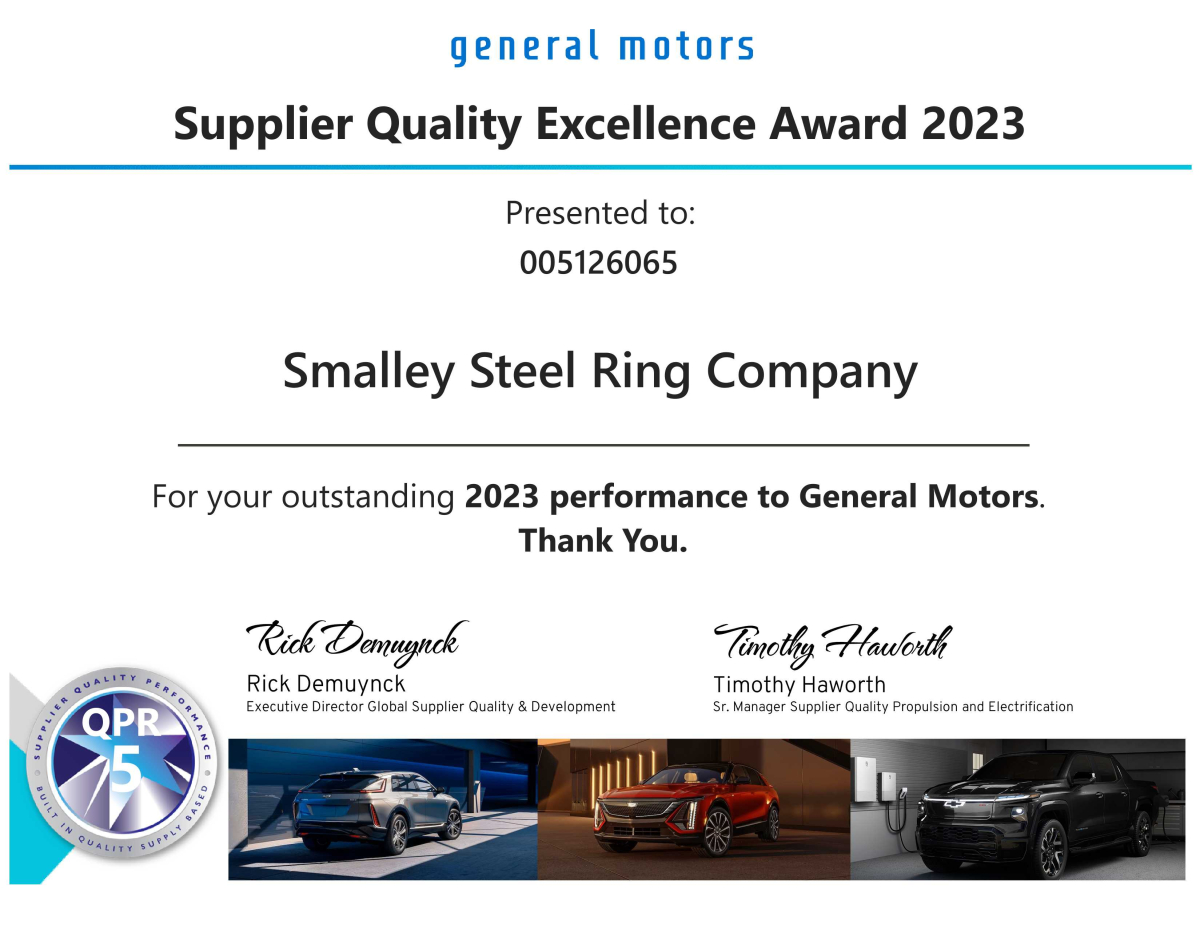 回顾这一成就,Smalley 运营副总裁 Lance Vondrak 在谈到这一成就时表达了他的感激之情:“获得通用汽车 2023 年供应商质量卓越奖是Smalley 每一位成员的重要成就。这证明了我们团队的共同努力、专业知识和不懈承诺。我们非常感谢这一认可,这激励我们继续努力工作。我们将继续致力于保持作为通用汽车可信赖供应商的地位。”